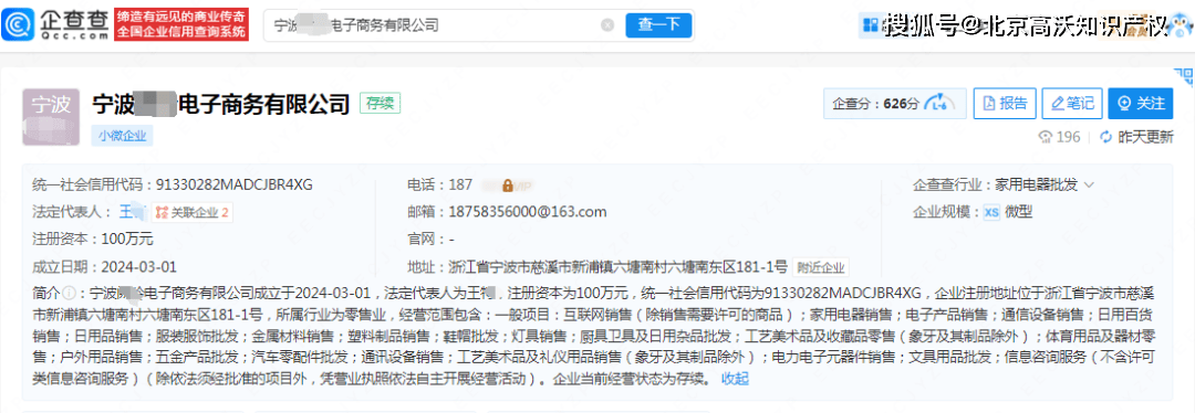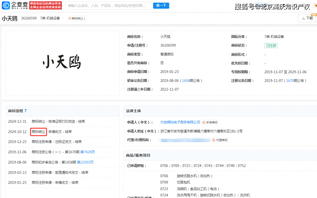 从企查查查询,“小天鸥”所属宁波某电子商务公司成立于2024年3月1日,让获得第36106599号“小天鸥”商标公用权。该商标申请日期为2019年1月23日,商标类别属“07机械设备”,商品及办事项为扭转式脱水机(非加热)、切面包机、洗碗机、食物加工机(电动)。目前商标形态为“已注册|撤三法式中”。
