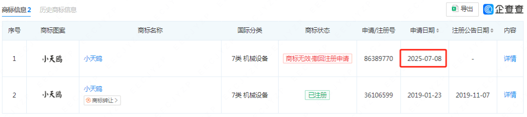 2025年7月8日,此举或为规避商标被撤销的风险而采纳的告急应对办法,不外,2025年9月18日,该公司即撤回了该商标申请。