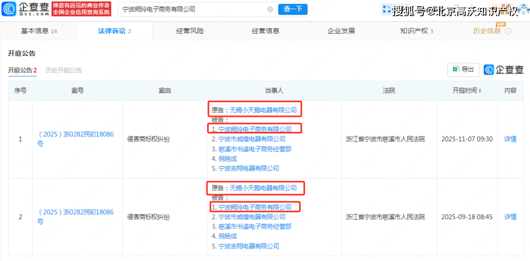 据企查查平台查询,小天鹅已两次将“小天鸥”所属的宁波某电子商务公司诉至法院,案由均为“侵害商标权胶葛”。