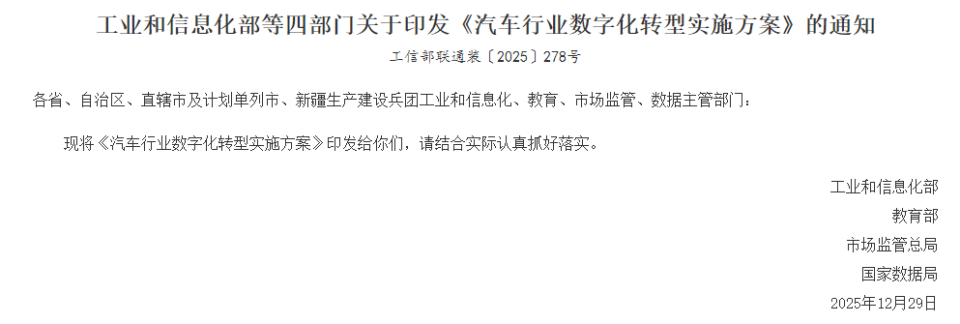 汽车财产是国平易近经济的主要支柱财产,财产链长、涉及面广、联系关系带动性强,是制制业数字化转型的沉点范畴。近年来,我国汽车行业数字化转型持续深化,加快向数字化、收集化、智能化演进,但仍存正在顶层设想不脚、数据要素使用不充实、零部件中小企业转型较慢等问题。为落实《制制业数字化转型步履方案》,鞭策汽车行业数字化转型、智能化升级,加速推进新型工业化,培育构成新质出产力,制定本实施方案。以习新时代中国特色社会从义思惟为指点,深切贯彻落实党的二十大和二十届历次全会,认实落实全国新型工业化推进大会摆设要求,以鞭策汽车行业高质量成长为方针,以智能制制为从攻标的目的,充实数据要素价值,深化人工智能等新一代消息手艺取汽车行业融合使用,提拔财产链供应链韧性和平安程度,为建立高端化、智能化、绿色化的现代化汽车财产系统供给支持。到2027年,整车标杆企业智能制制能力成熟度品级提拔一档,零部件企业数字化程度显著提拔,研发设想东西普及率超95%,环节工序数控化率超70%;行业全员劳动出产率较2025年提拔10%,产物研发周期及交付周期缩短20%;打制可复制推广的智能工场样板,培育20家以上行业智能制制系统处理方案供应商;构成适合财产特征、国际先辈的数字化转型和智能制制尺度系统、手艺供给系统取人才培训系统。到2030年,行业全体数智化成长达到较高程度,数字化取营业深度融合;大中小各类企业数字化协调成长,供应商系统不竭健全;根基建成婚配行业成长程度的数字化公共办事系统,支持保障程度大幅提拔。1。 完美诊断评估系统。连系智能制制能力成熟度评估、中小企业数字化程度评测等评价系统,充实跟尾制制业数字化转型通用评估目标系统,成立健全合适整车、零部件及汽车办事等类型企业特点的数字化转型、智能化升级评估系统,提拔评估可操做性。成立沉点企业动态评估机制,按期开展复评。2。 鞭策企业开展自评取诊断。激励企业依托数字化转型正在线评估平台开展自评估工做,精准识别企业数字化转型、智能化升级的亏弱环节。组织第三方办事机构开展入企诊断办事,系统实施智能制制能力、数据办理能力等成熟度评估,科学制定“一企一策”转型方案,指点企业提拔。3。 加业内交际流取经验推广。支撑成立行业协同工做机制,激励打制汽车行业数字化、智能制制等财产联盟组织,办事行业大中小企业融通成长,推进汽车、消息通信等行业企业跨界立异。健全行业数智化升级公共办事系统,编制手艺、场景推广目次和智能工场典型案例,推进学问共享、经验交换取资本整合。4。 梯次推进零部件中小企业数字化转型。面向小微企业推广普惠性“上云用数赋智”办事,加速企业表里网升级,提拔数字化根本程度。面向省级专精特新中小企业、规上工业中小企业支撑实施沉点场景深度,沉点鞭策汽车零部件中小企业开展“哑”设备和环节设备更新。面向专精特新“小巨人”企业支撑开展系统化集成,培育一批具有示范效应的数字化程度四级标杆企业,打制一批先辈级、杰出级智能工场。5。 指导工业互联网深度使用。激励扶植汽车行业5G工场,推广“5G+工业互联网”典型使用场景。支撑扶植赋能研发设想、出产制制、供应链协同的行业级工业互联网平台,充实阐扬汽车行业标识解析二级节点感化,鞭策零部件中小企业全面接入。推广工业互联网平台驱动的财产链“链式”转型,打制“平台+节点+财产链+企业”协同成长模式,实现财产链资本优化设置装备摆设和企业间高效协做。6。 鞭策财产链供应链数字化协同升级。支撑汽车行业可托数据空间扶植,推进整车取零部件、交通物流等企业正在研发设想、出产制制、仓储物流、运转工况和收受接管操纵等环节环节实现数据共享互通,打制供应链全局优化的新型“整零协同”模式。推广头部企业牵引的供应链“链式”转型,支撑头部企业阐扬手艺和办理劣势,数字系统接口,激励中小企业自动融入大企业供应链数字化系统,强化中小企业正在供应链上的配套能力,构成一批聪慧供应链案例。7。 精准培育行业典型场景取处理方案。制定汽车行业数智化转型典型场景清单及图谱,成立动态场景库。学问模子、东西软件和人才技术等转型要素,构成要素参考,加将近素平台化沉淀和收集化共享。激励行业头部企业取软硬件设备企业、办事商等结合开辟尺度化、模块化处理方案。支撑深耕汽车行业的数字化转型推进核心阐扬专业化感化,鞭策场景和处理方案共享。8。 加快环节环节人工智能使用拓展。支撑企业正在研发设想、出产制制、运营办理等环节深度集工智能手艺,打制汽车行业大模子和丰硕智能体使用,摸索正在软件取智能化研发、智能工艺规划取虚拟调试等范畴打制垂域大模子。组织行业“人工智能+”使用步履,遴选一批人工智能立异使用标杆案例。鞭策智能机械人正在焊接、喷涂、总拆等环节规模化使用,打制汽车行业具身智能示范产线。9。 持续开展智能工场梯度培育和推广。按照“试点示范—标杆引领—全面推广”径实施梯度培育工做,支撑头部企业打制杰出级、领航级智能工场。通过编制案例集、召开现场会、组建专家办事团等形式,鞭策“场景—车间—工场”转型经验输出。全面推进汽车制制环节工业操做系